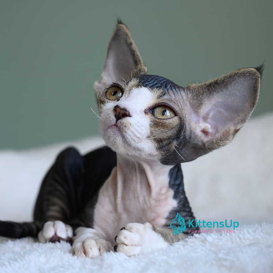 Meet Ignis Rey, an adorable Devon Rex kitten with a unique short coat and big expressive eyes. This playful and affectionate kitten is ready to bring joy and charm into your home.